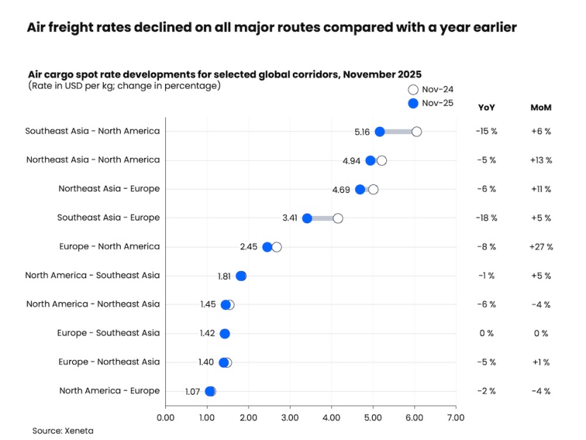 在所有主要贸易航线上,11月份的航空货运现货价格均低于去年同期。欧洲-北美航线首次出现同比下降,运费下降了8%,跌幅超过全球平均水平的5%。11月,该航线现货运价环比仍大幅上涨27%,但远低于去年因运力大量转向电商密集航线而出现的42%暴涨。