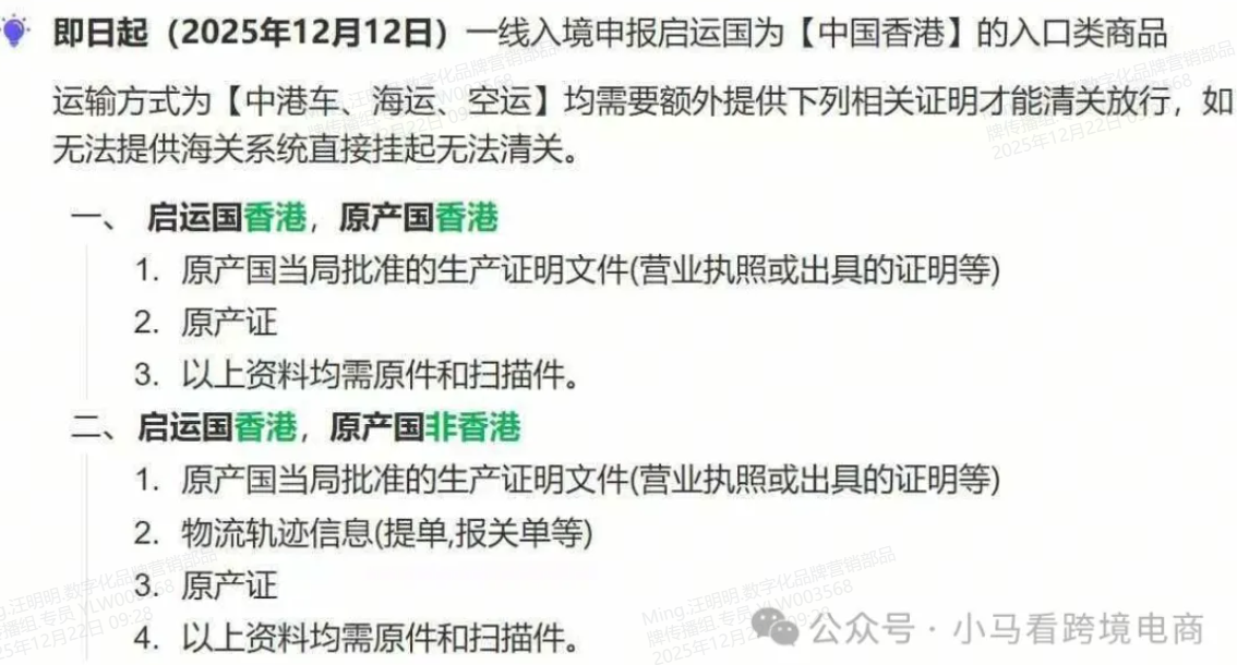 其三,物流轨迹追溯要求升级,需提供从原产国(地区)到国内启运地(重点为中国香港)的完整物流凭证,含全程提单、报关单等,实现货物源头到口岸的全链路可查;其四,原产地证明仍为核心必备材料,且针对不同原产国场景细化要求,避免“产地不符”问题。