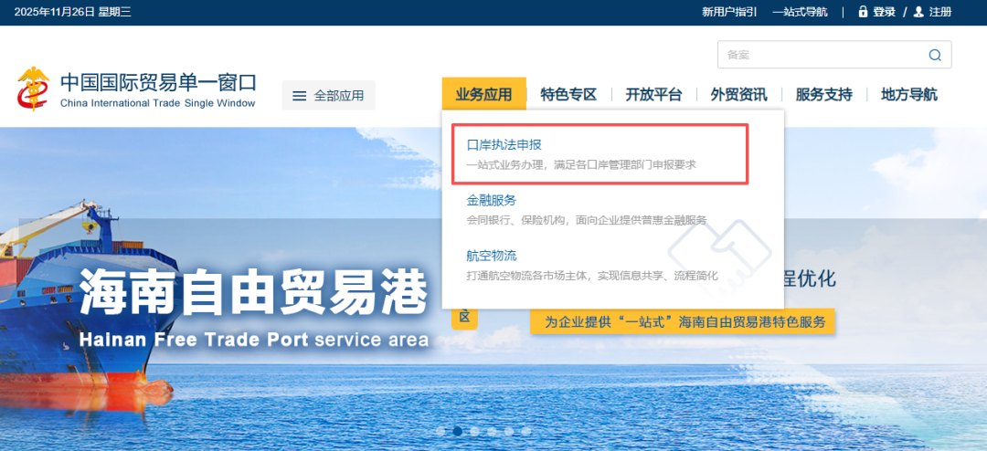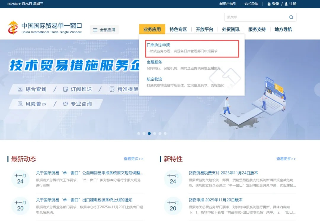 浏览器输入http://www.singlewindow.cn登录中国国际贸易单一窗口,点击【业务应用】栏里的【口岸执法申报】