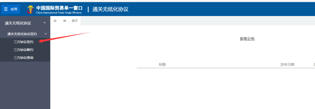 通关无纸化协议系统页面进入左侧菜单【三方协议签约】