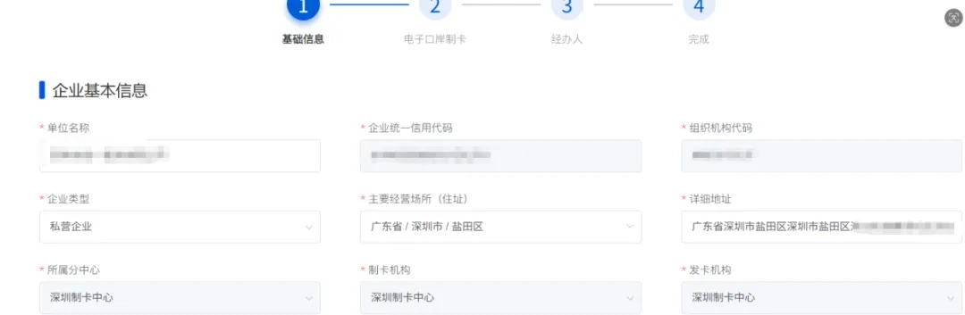 进入企业基础信息录入,填写完相关信息后,电子口岸卡完成办理