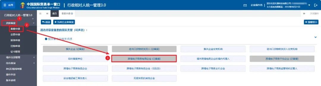 点击左边菜单【资质备案】栏目的【备案申请】,选择【跨境电子商务电商企业】