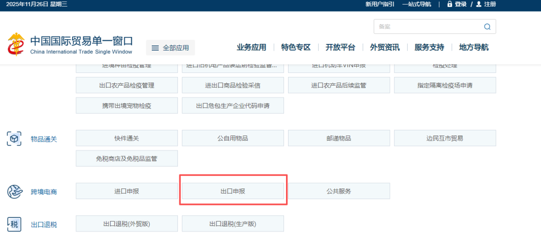 口岸执法申报页面找到【跨境电商】点击【出口申报】