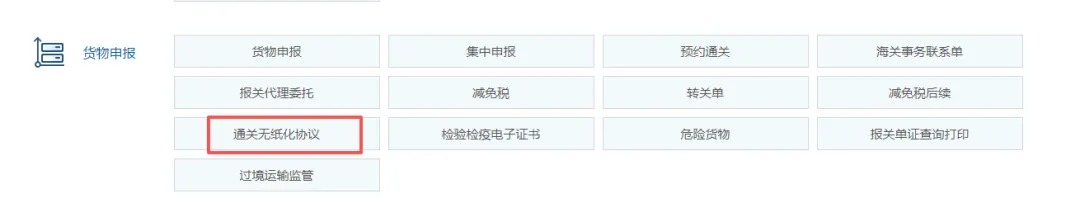 口岸执法申报业务应用界面找到【货物申报】栏目里的【通关无纸化协议】