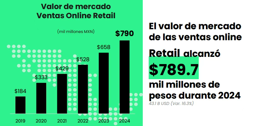 首先,作为拉丁美洲第二大经济体,墨西哥电商市场潜力无疑是巨大的:人口规模大且年轻群体占比高,互联网普及率也在逐渐攀升。根据墨西哥在线销售协会(AMVO)的研究报告显示,2024年墨西哥在线零售市场收入达到7897亿比索,同比增长约20%。