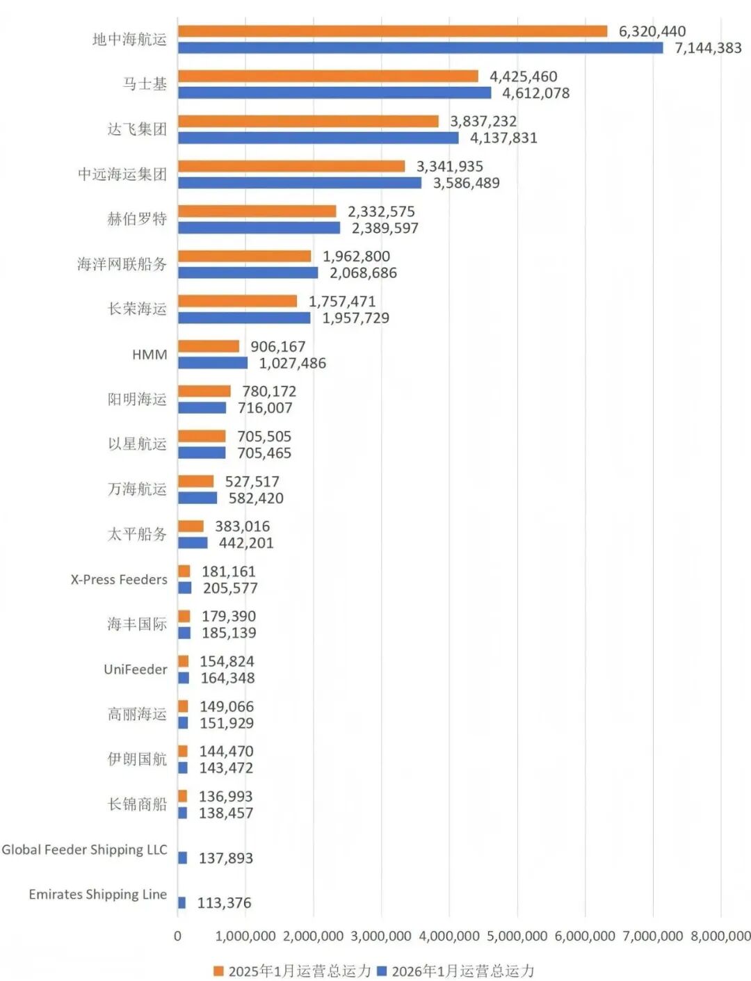 全球前20大班轮公司2025年1月-2026年1月总运力变化,单位:TEU