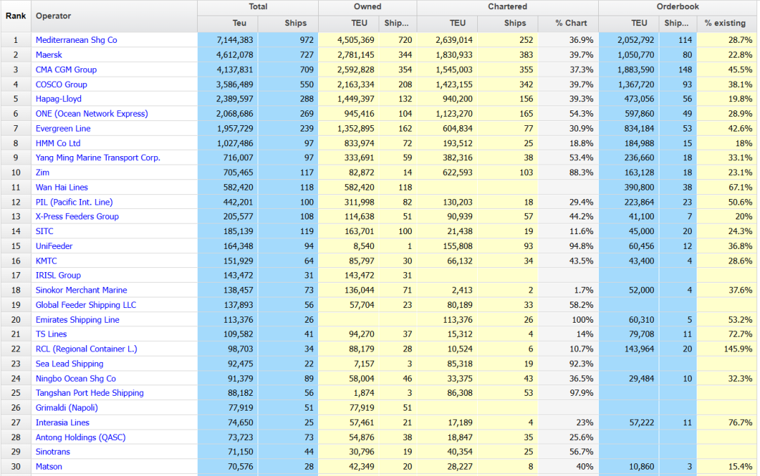 这意味着,全球运力排名前8位的班轮公司中,除赫伯罗特外,其他公司的运力增幅都超过了10万TEU。