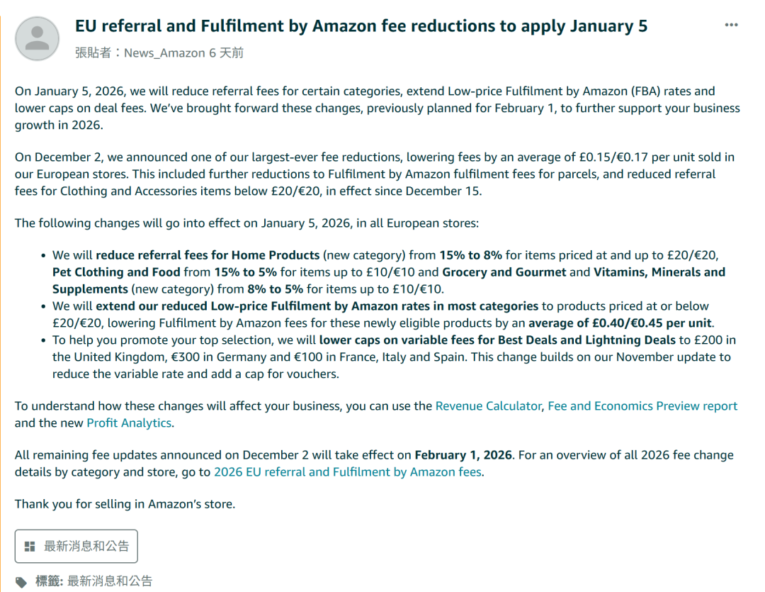 先看欧洲。AMZ123获悉,亚马逊在欧洲站宣布的一揽子费率调整中,部分降费被提前到2026年1月5日执行(原计划为2月1日),包括下调部分品类的推荐费、扩大低价FBA适用范围,并降低BD/LD等促销活动的可变费用上限。