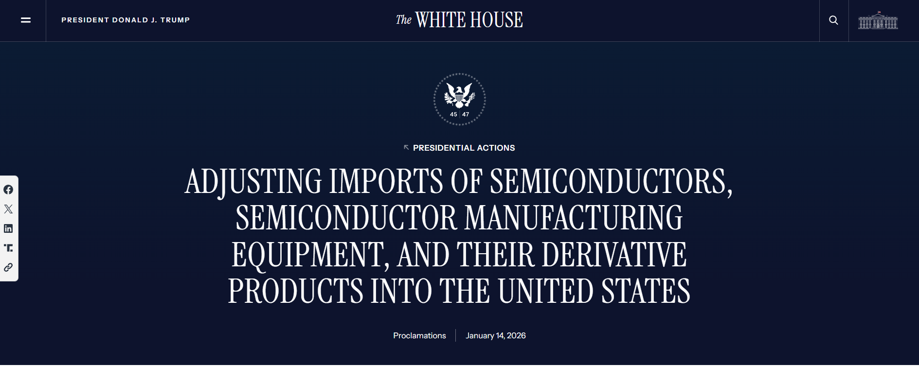 美国白宫于 当地时间2026年1月14日 在官网发布公告,宣布自 2026年1月15日 起,对部分进口半导体、半导体制造设备及其衍生产品征收 25% 的进口从价关税。