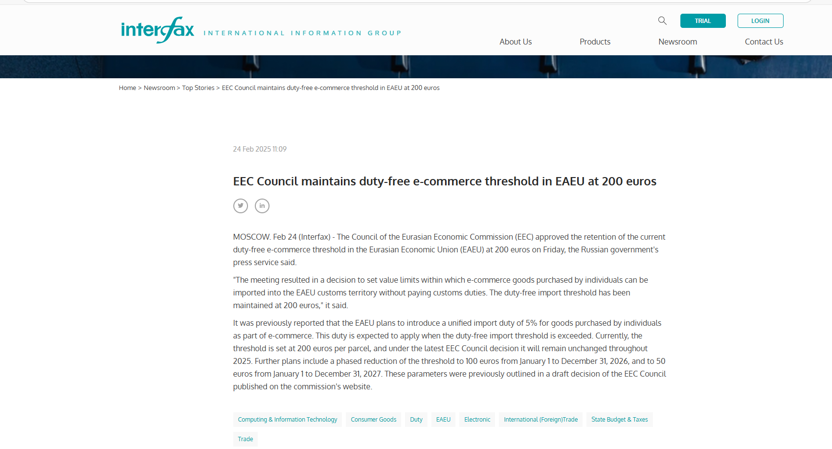 近日,欧亚经济委员会(EEC)理事会正式批准欧亚经济联盟(EAEU)新的跨境电商进口监管规则。根据该决定,联盟成员国将自2026年7月1日起,在联盟范围内统一实施个人跨境电商商品进口管理新制度,其中个人电商进口商品的免税额度被设定为200欧元。