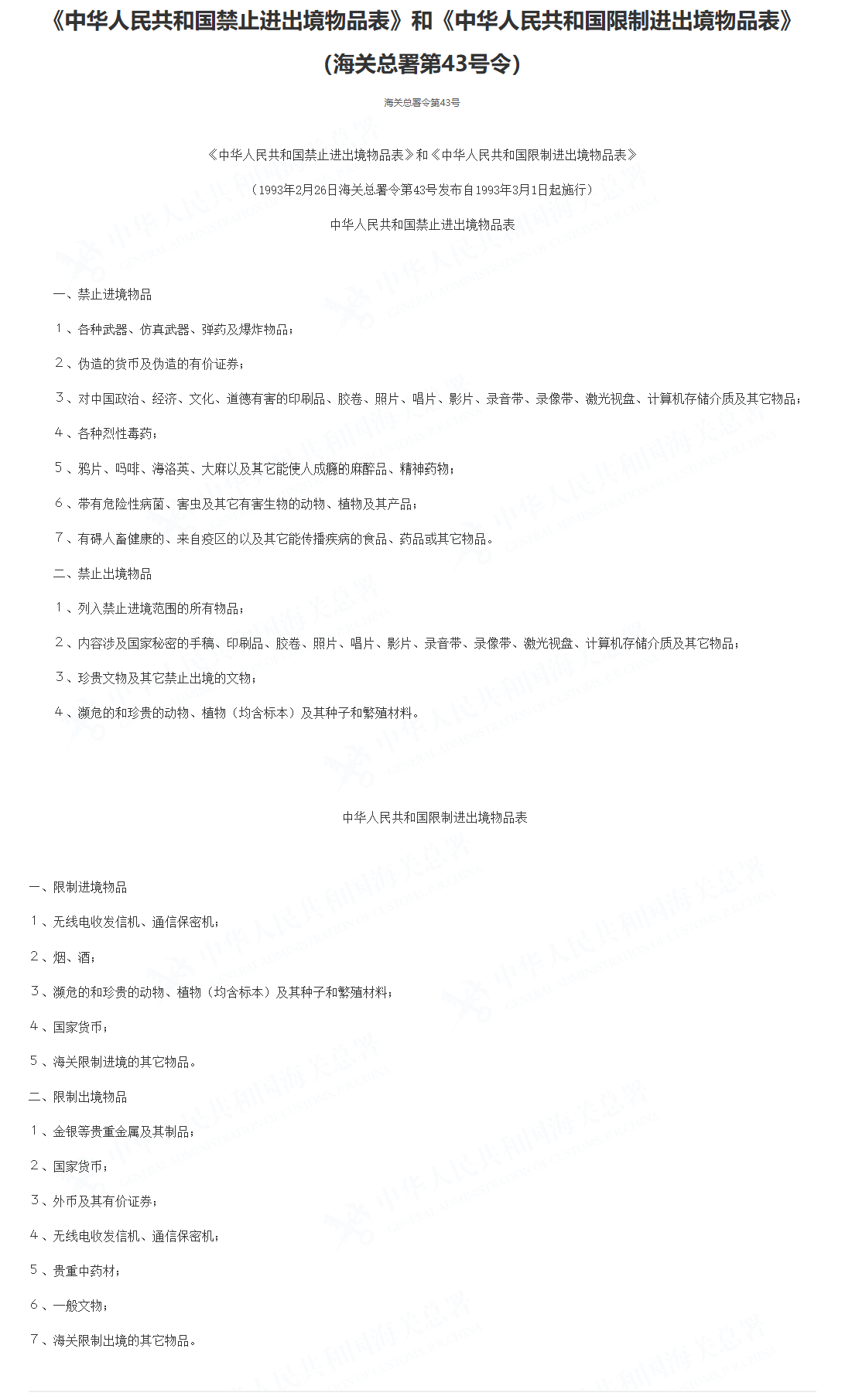 下列物品 严禁以任何形式进入中国境内: