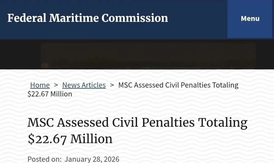 北京时间今天凌晨,美国联邦海事委员会(FMC)发布官方公告,宣布对地中海航运公司(MSC)处以合计2267万美元的罚款,原因是这家船公司多次违反《美国航运法》(Shipping Act)。