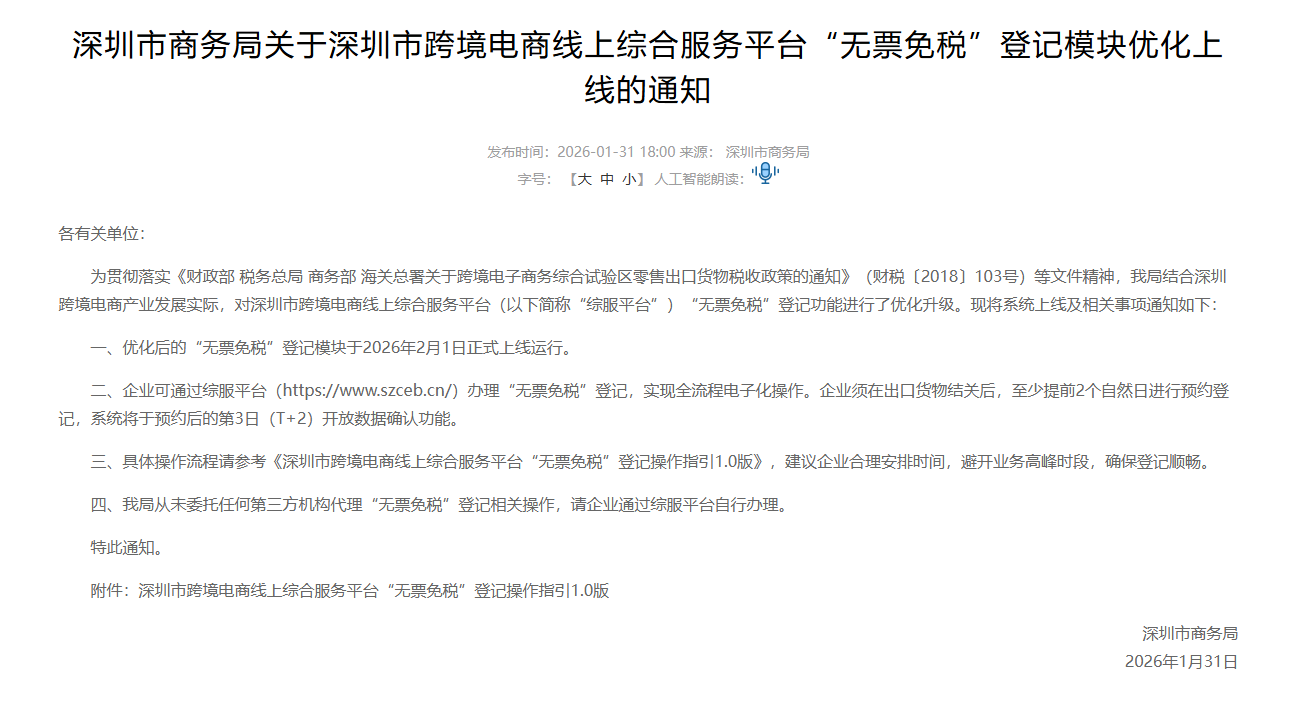 深圳市商务局已于2026年1月31日正式发布通知,宣布其跨境电商线上综合服务平台(以下简称“综服平台”)的“无票免税”登记模块优化版将于2026年2月1日正式上线运行。