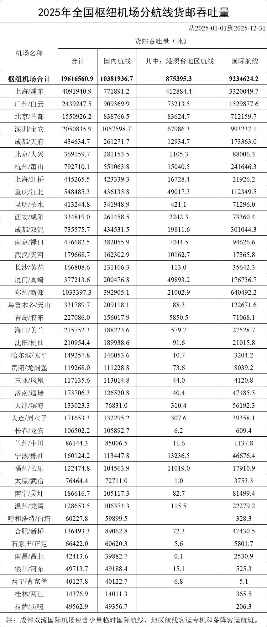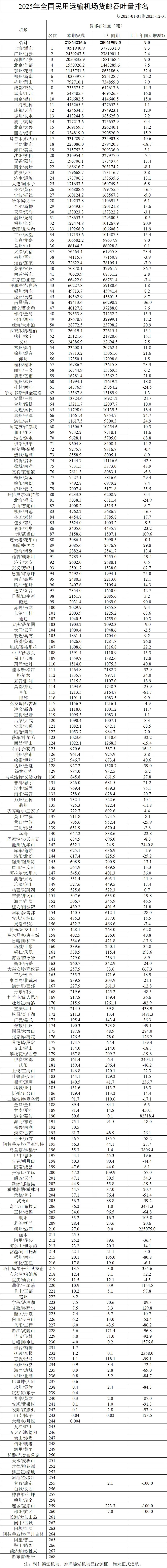 2月26日,民航局公布《2025年全国民用运输机场生产统计公报》,现将关于2025年货邮货邮吞吐量完成情况整理如下: