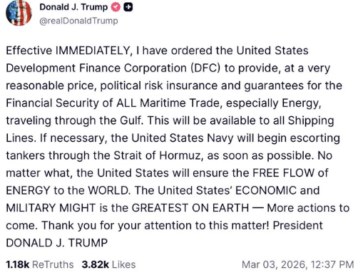 近日,美国总统 Donald Trump 表示,已指示 U.S. International Development Finance Corporation(DFC)为通过 Strait of Hormuz 的海上贸易提供政治风险保险及相关金融担保,重点覆盖能源运输。