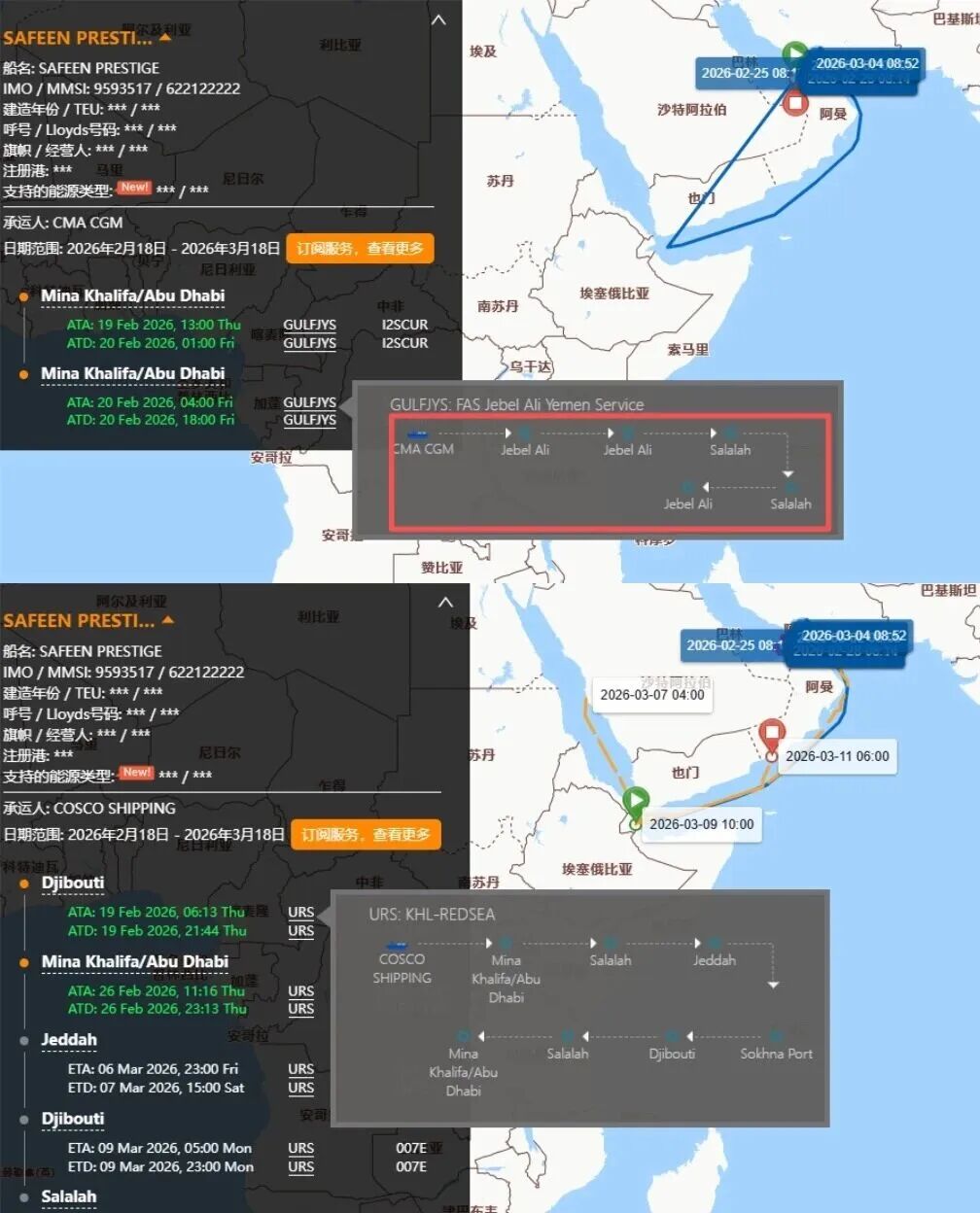 其承运人为CMA CGM,并显示服务于COSCO的URS(KHL-REDSEA)波斯湾、红海及亚丁湾环线,和CMA的FAS杰贝阿里—也门航线(GULFJYS)。