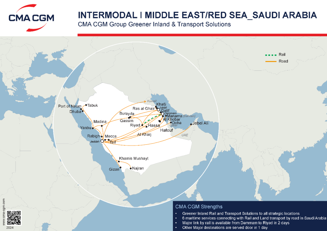 路线整体分为海运与陆运两段,衔接顺畅且基建完善。海运段以吉达伊斯兰港为核心,作为沙特最大集装箱港,其承担全国65%的海上贸易,可停靠全尺寸船舶,全球主要船公司均已布局红海直航航线,能有效避开霍尔木兹海峡风险。港口具备充足堆存能力与高效卸货效率,24小时不间断作业可保障货物快速中转。