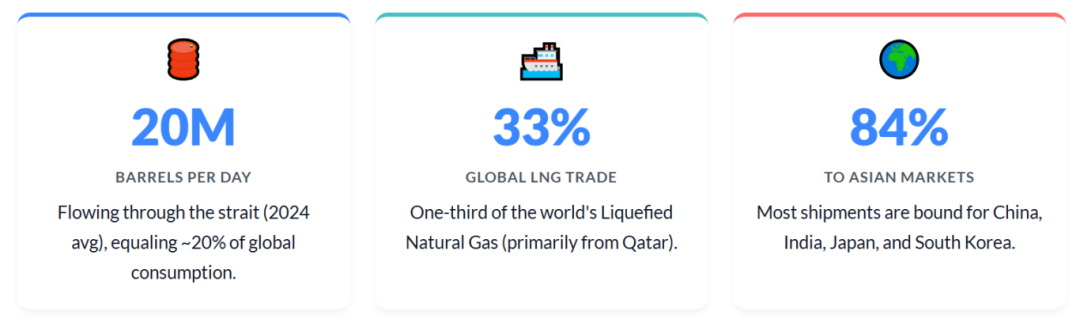 根据国际能源署的数据,2025年经霍尔木兹海峡运输的原油日均1500万桶、石油产品日均500万桶,约占全球海运石油贸易总量的25%。沙特阿拉伯是最大的使用者,其次为伊拉克、阿联酋、伊朗和科威特。此外,全球约33%的液化天然气贸易也途经该海峡,其中卡塔尔占九成以上。