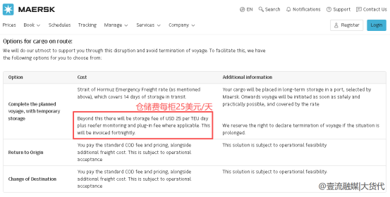按原计划完成航程,进行临时存储——马士基将收取上述紧急货运费率,以及每个标准箱每天25美元的仓储费、冷藏箱监控费和插电费(如适用),同时如果情况持续恶化,马士基保留终止航程的权利。