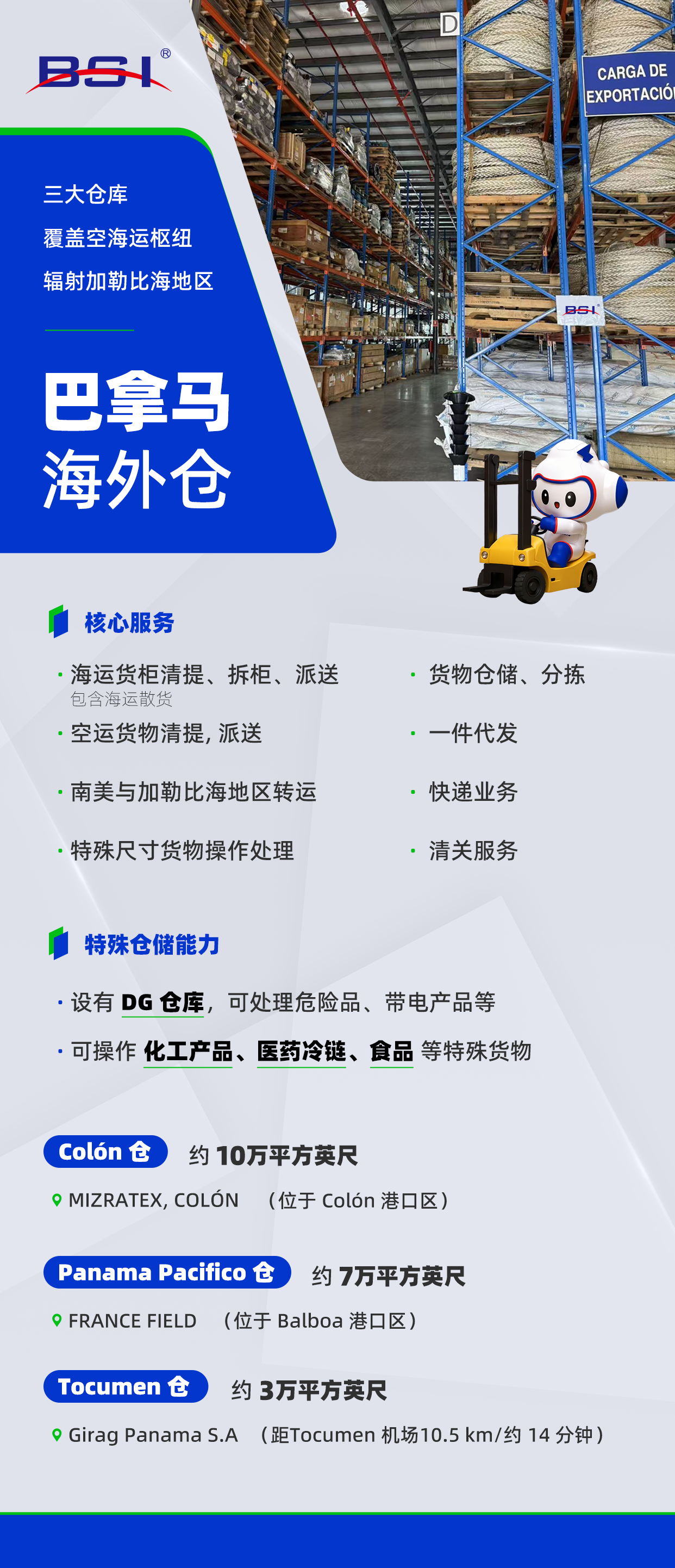 依托巴拿马连接南北美洲、贯通太平洋与加勒比海的区位优势,BSI在当地布局三大核心仓储中心,总仓储面积约 200,000 平方英尺,可提供仓储、清关及区域配送等一体化物流服务,助力企业高效拓展中美洲及加勒比海市场。