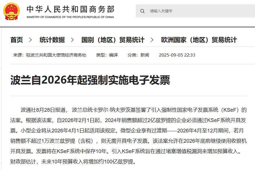法律依据:只要卖家在波兰注册为增值税纳税人(拥有波兰NIP税号,无论是注册总部还是常设机构),向波兰境内客户或欧盟客户(B2B出口)开具的发票,必须通过KSeF系统生成结构化发票。