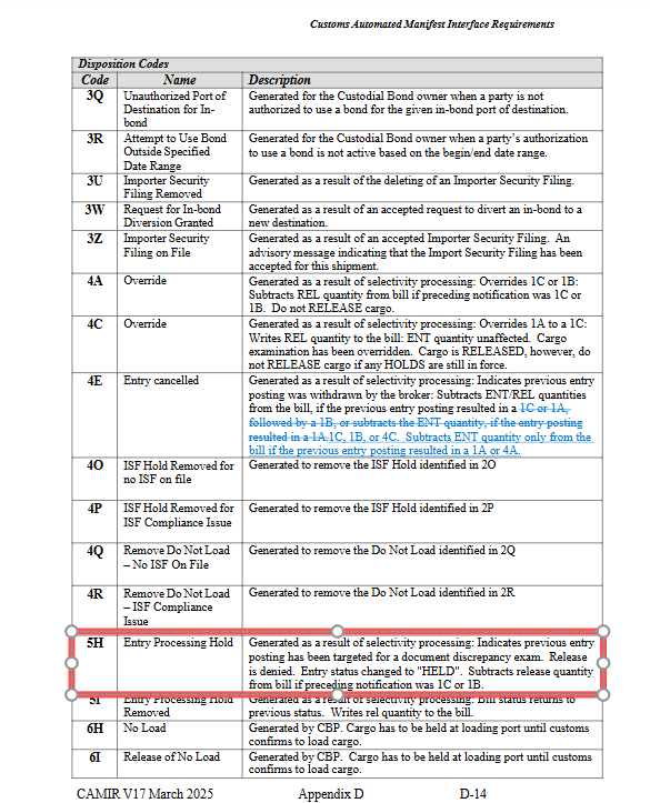 业内人士指出,“5H Hold”并非新的查验制度,而是美国海关在自动化清关系统中用于 报关处理暂扣(Entry Processing Hold) 的一种状态代码。