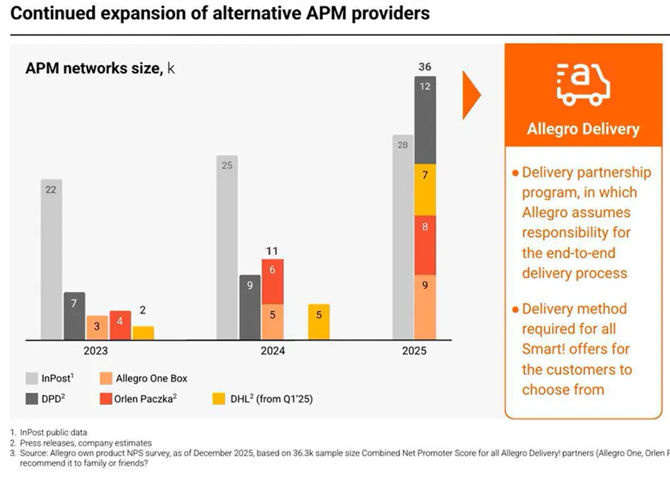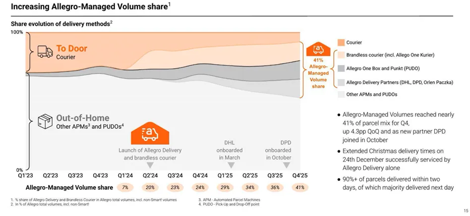 自有配送占比飙升:Allegro Delivery自有系统处理包裹占比一年提升17个百分点,2025年第四季度达41%,从电商平台转型为具备实际竞争力的物流玩家。